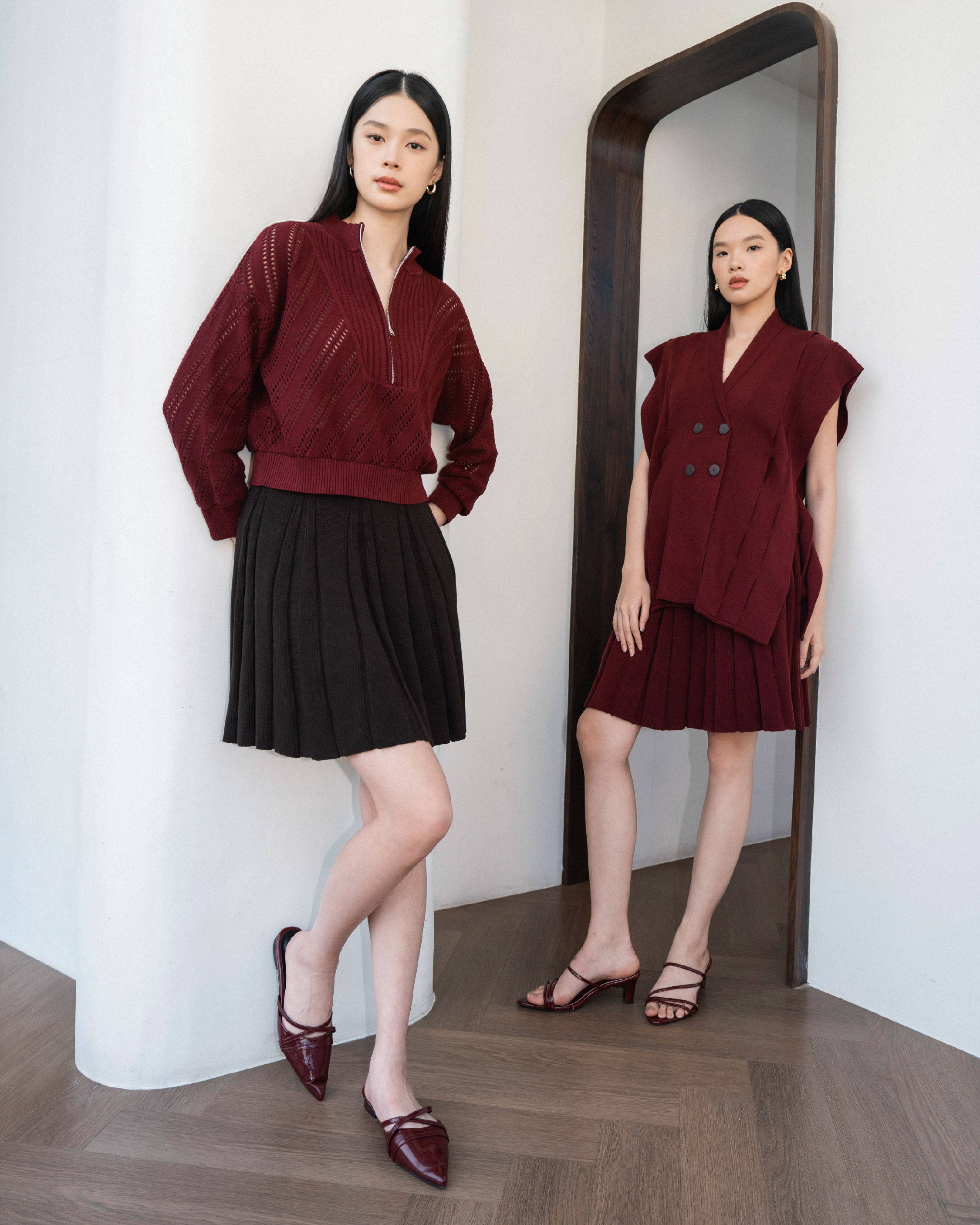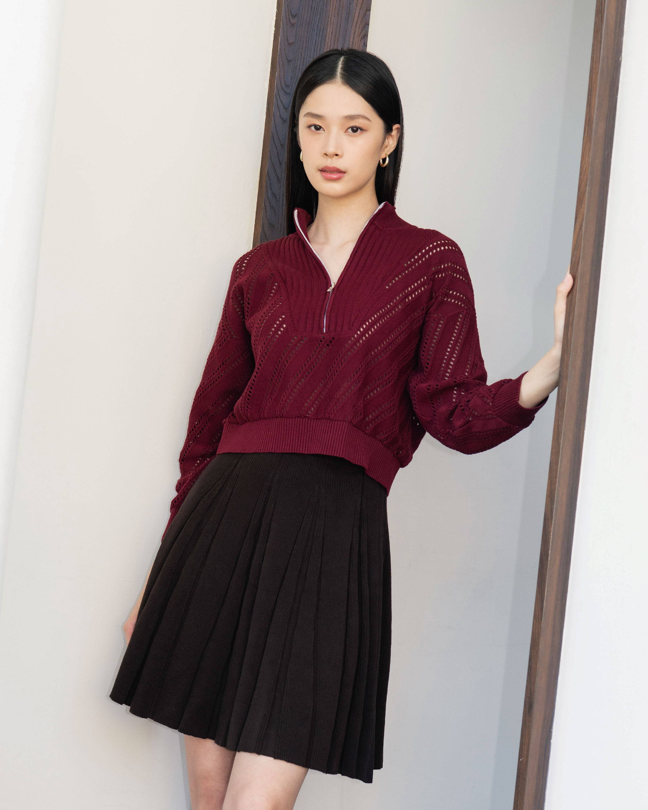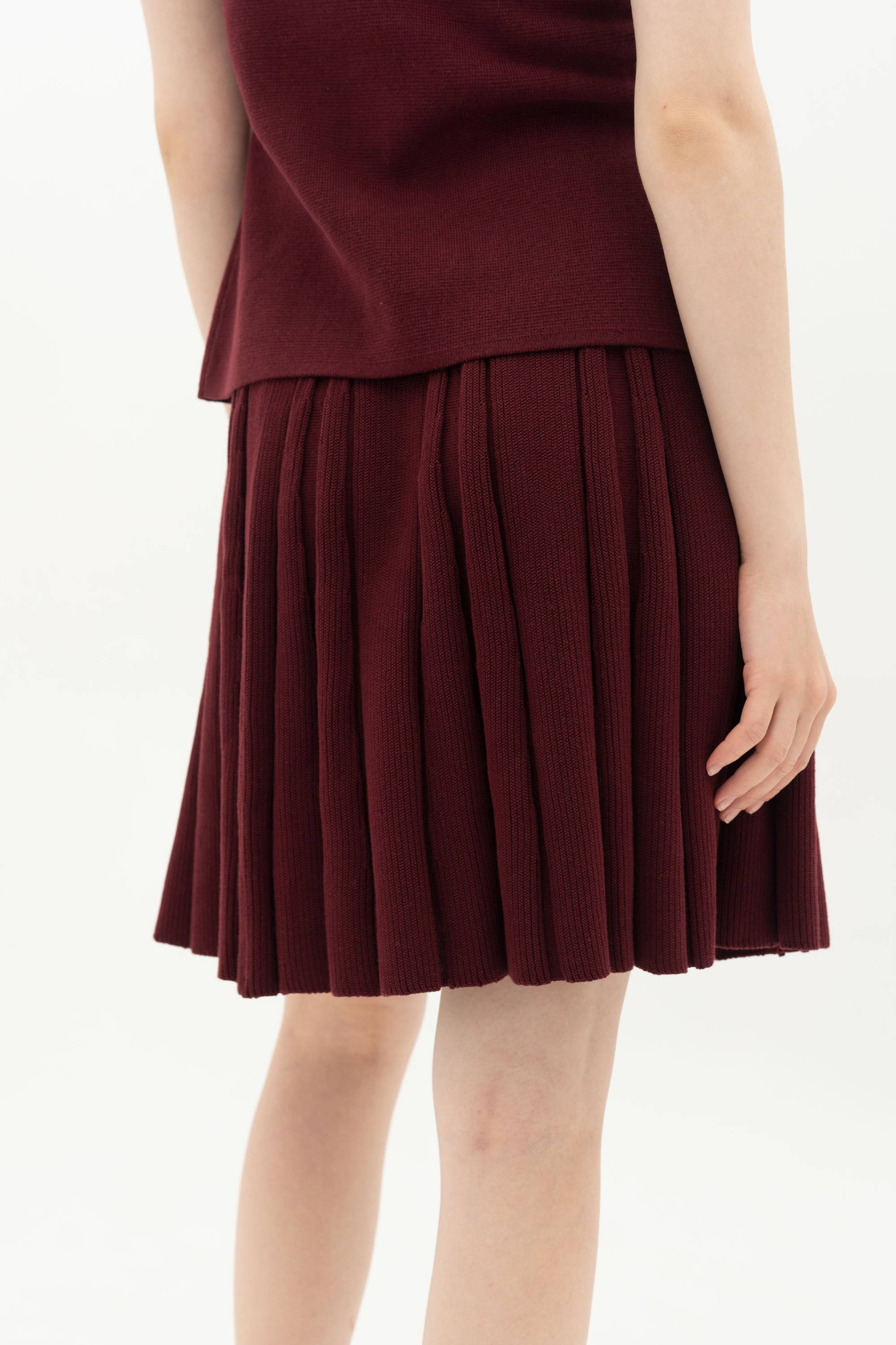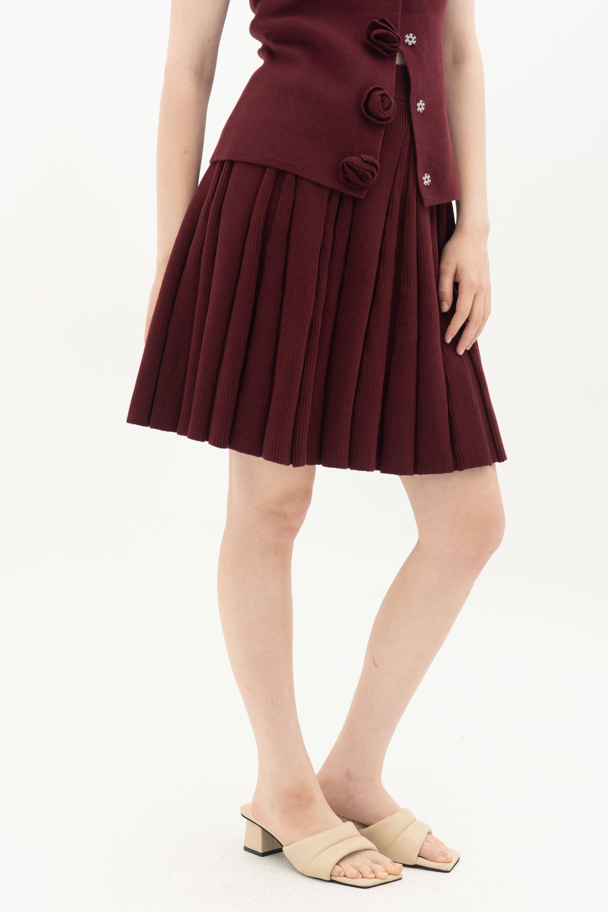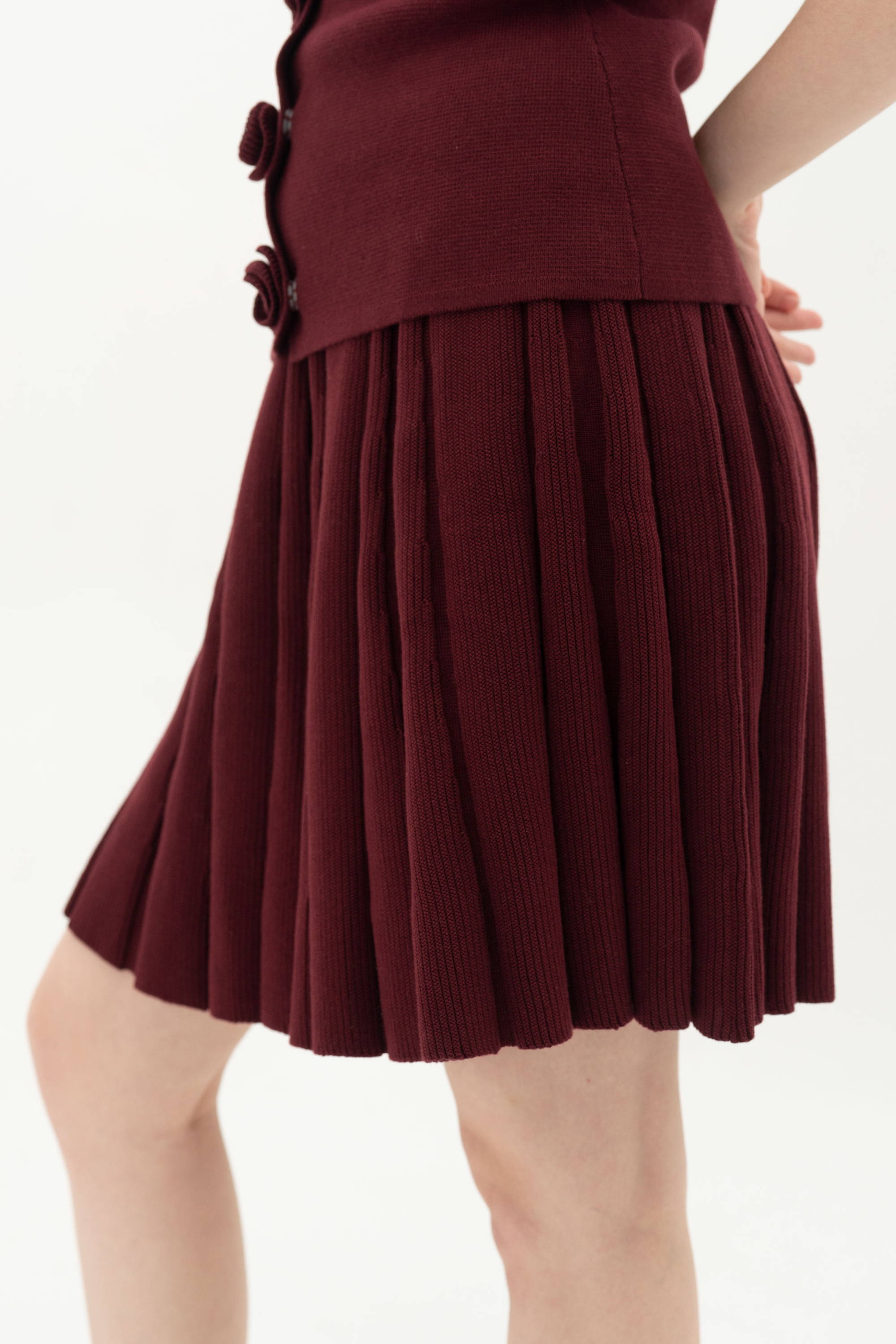 When worn, the maroon shade gives the skirt a deeper and more expressive look. The pleats sway delicately and create a fresh, youthful energy that pairs beautifully with the matching sweater.