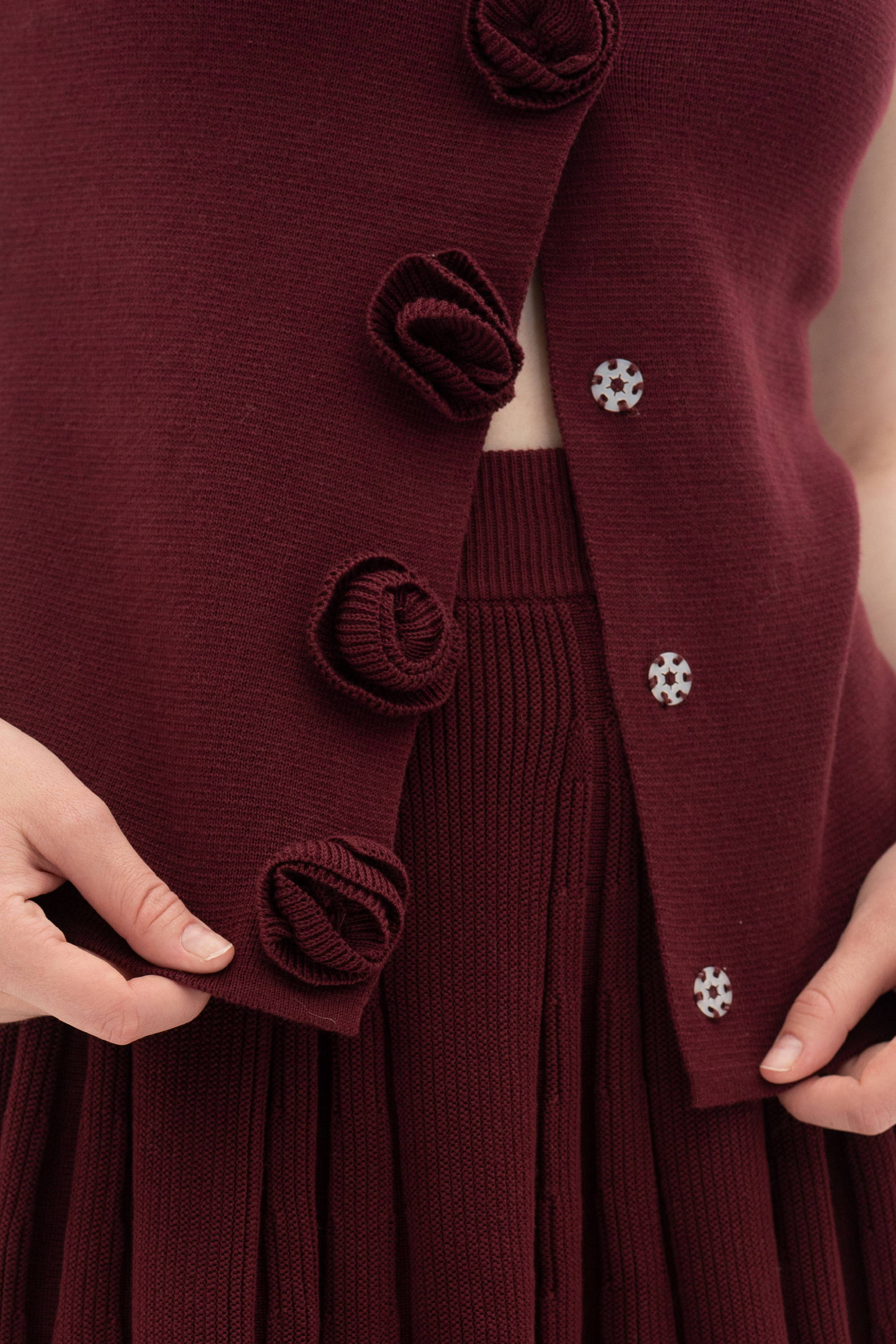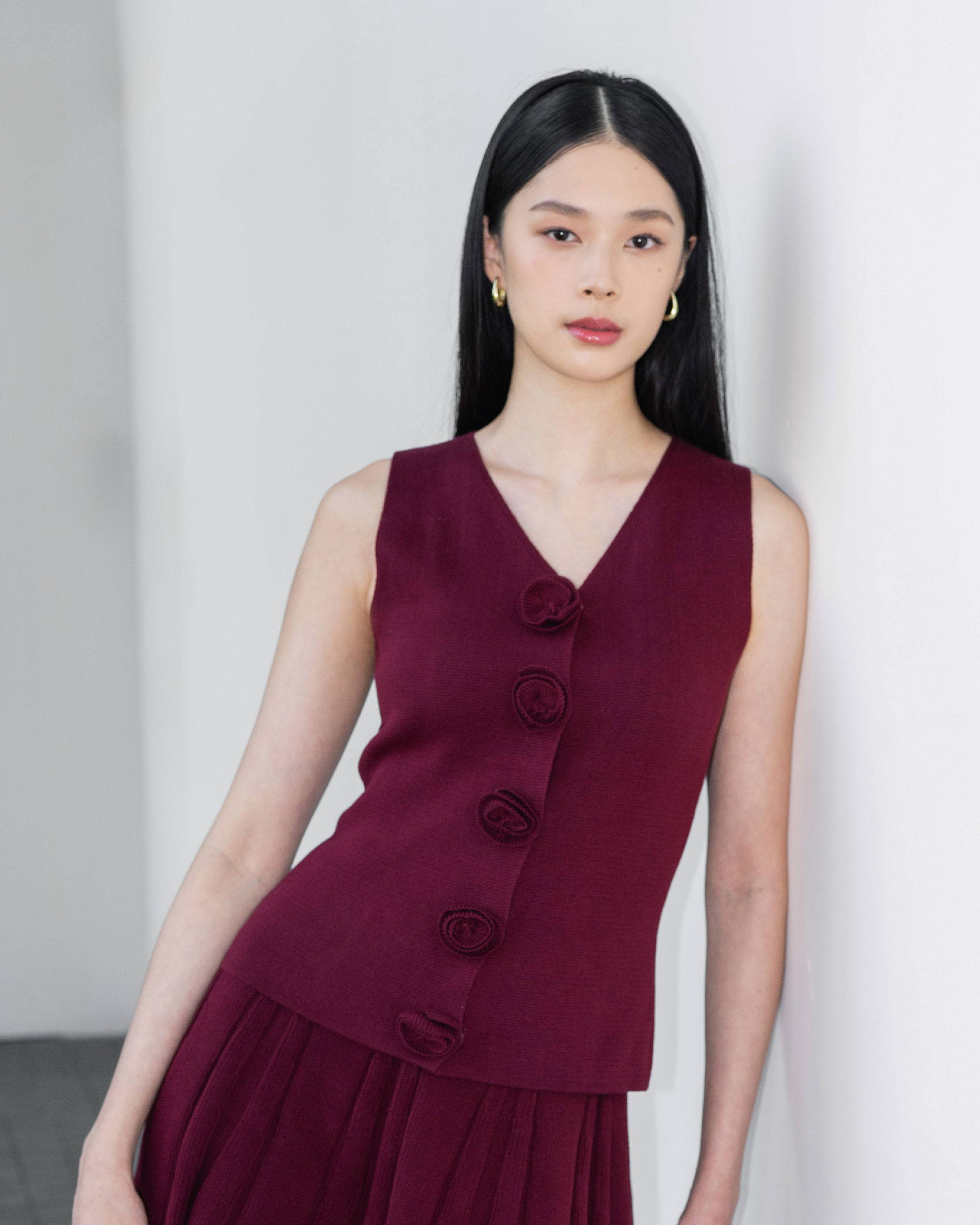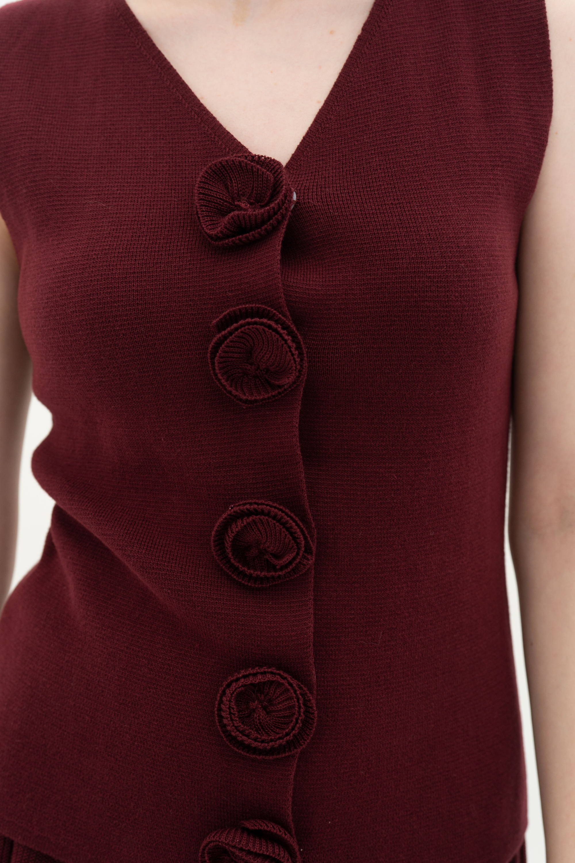 When worn, the vest sits close to the body and lets the rosette buttons stand out beautifully. The maroon shade deepens its romantic feel and adds a sense of softness and sophistication.