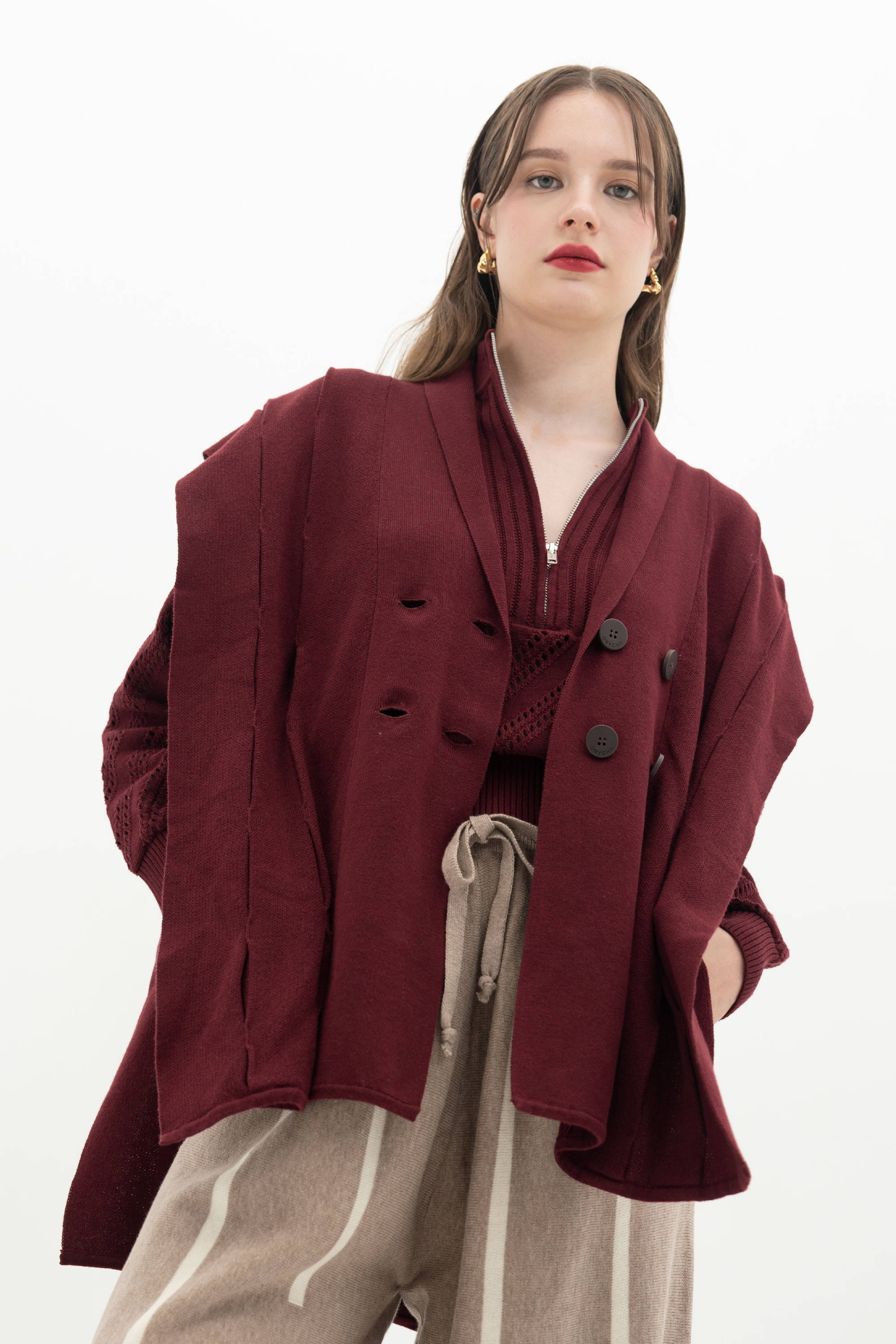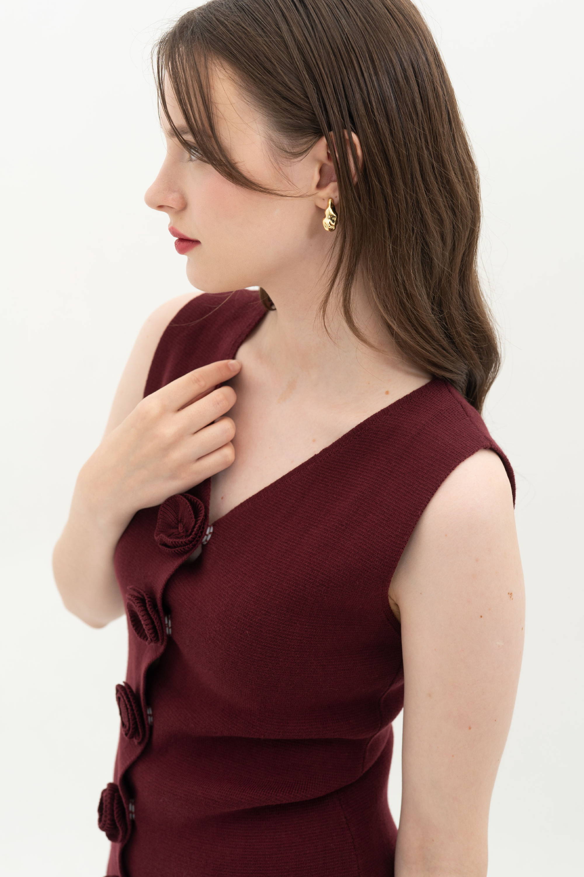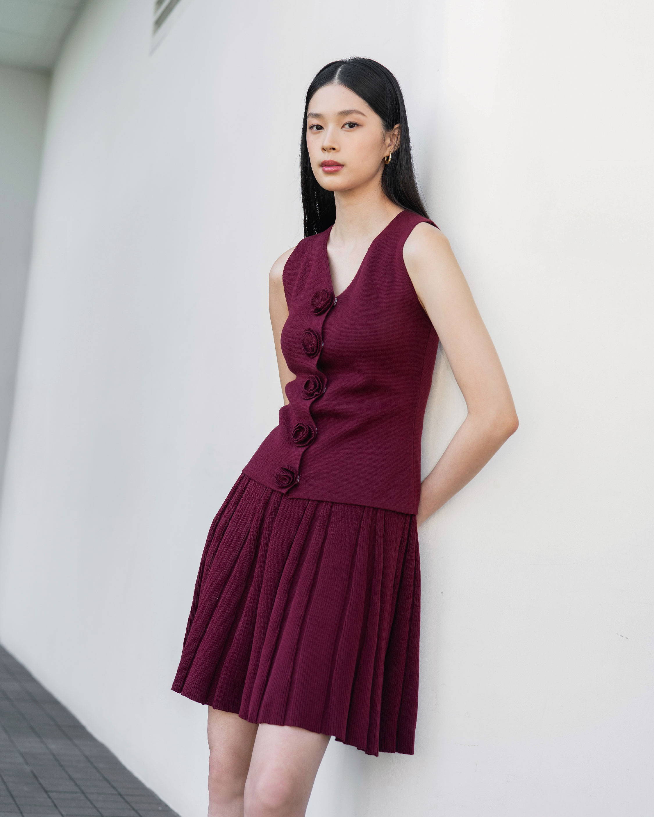 When worn, the vest sits close to the body and lets the rosette buttons stand out beautifully. The maroon shade deepens its romantic feel and adds a sense of softness and sophistication.