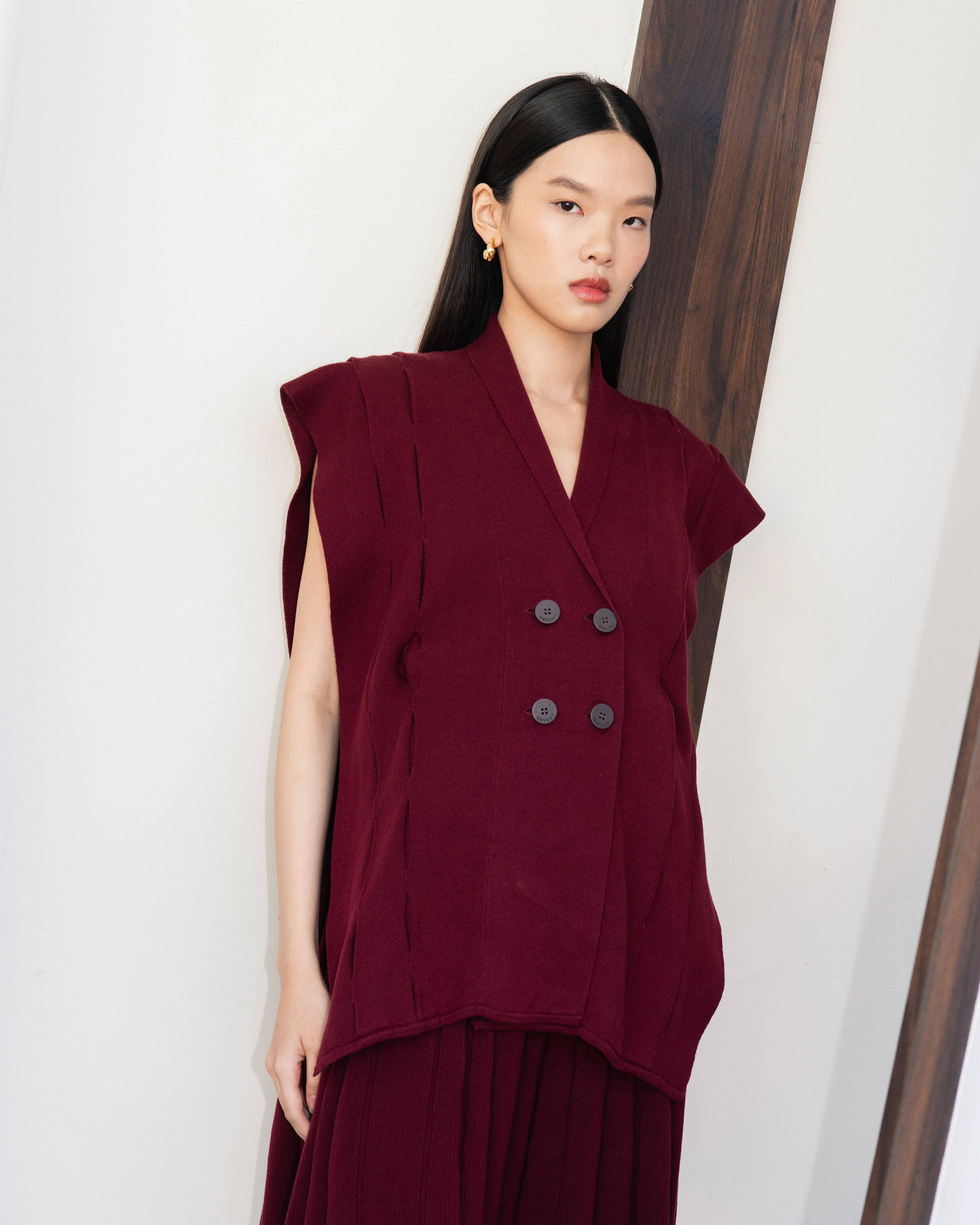 When worn, the vest moves gracefully and instantly elevates even the simplest outfit. The maroon color highlights its sculptural shape and gives it a bold yet elegant presence.