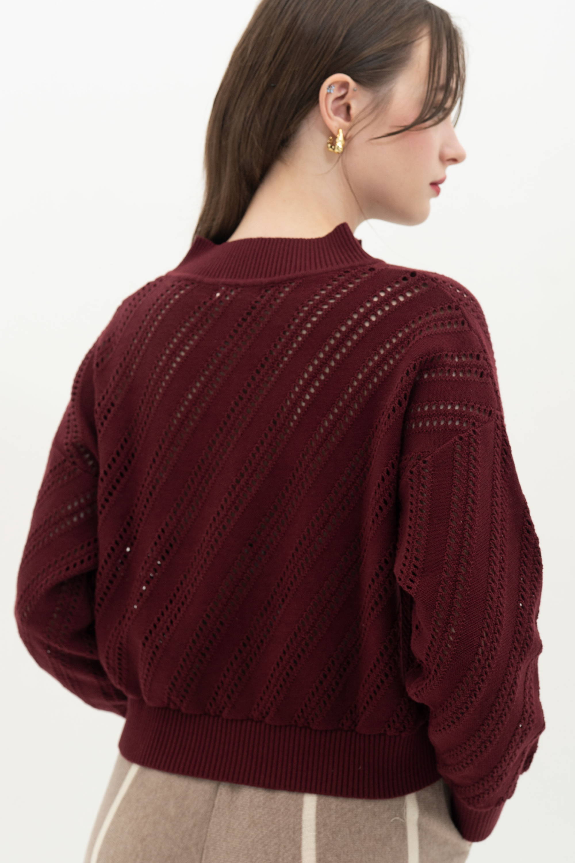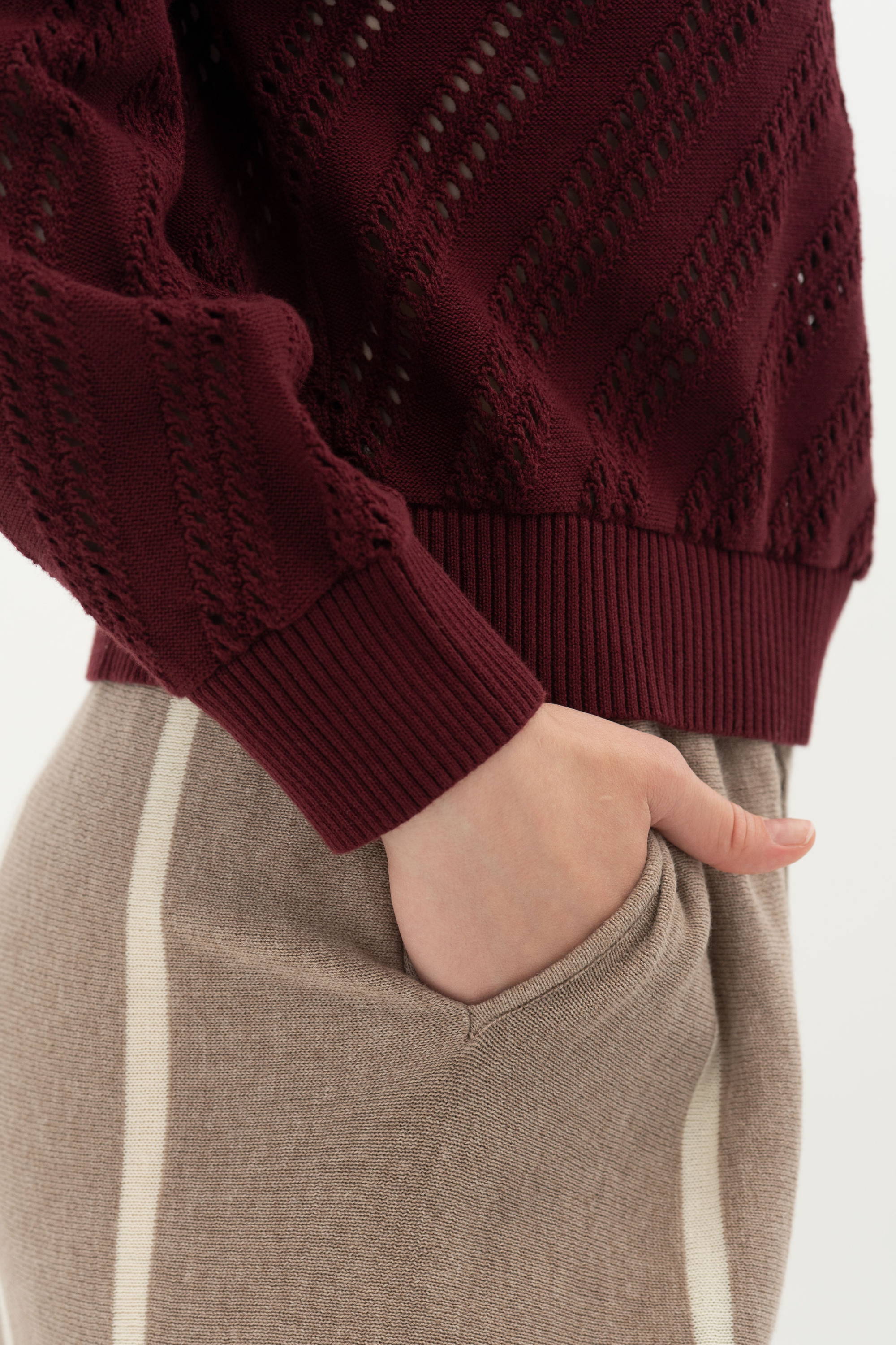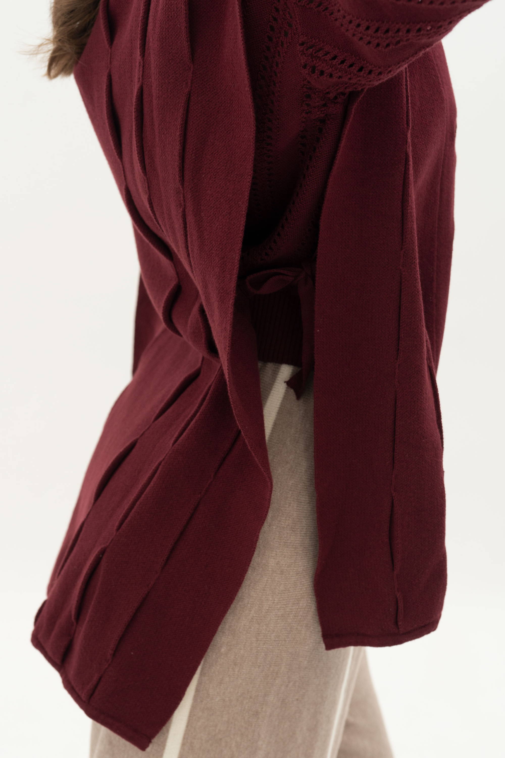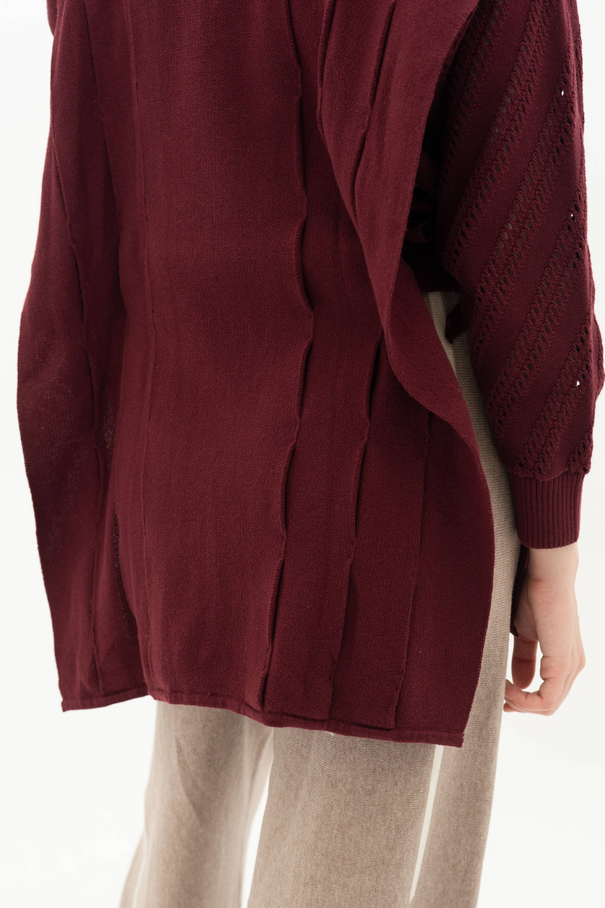 When worn, the sweater drapes softly on the body and creates a look that feels relaxed yet well polished. The maroon color adds depth to the knit texture and gives the piece a richer character.