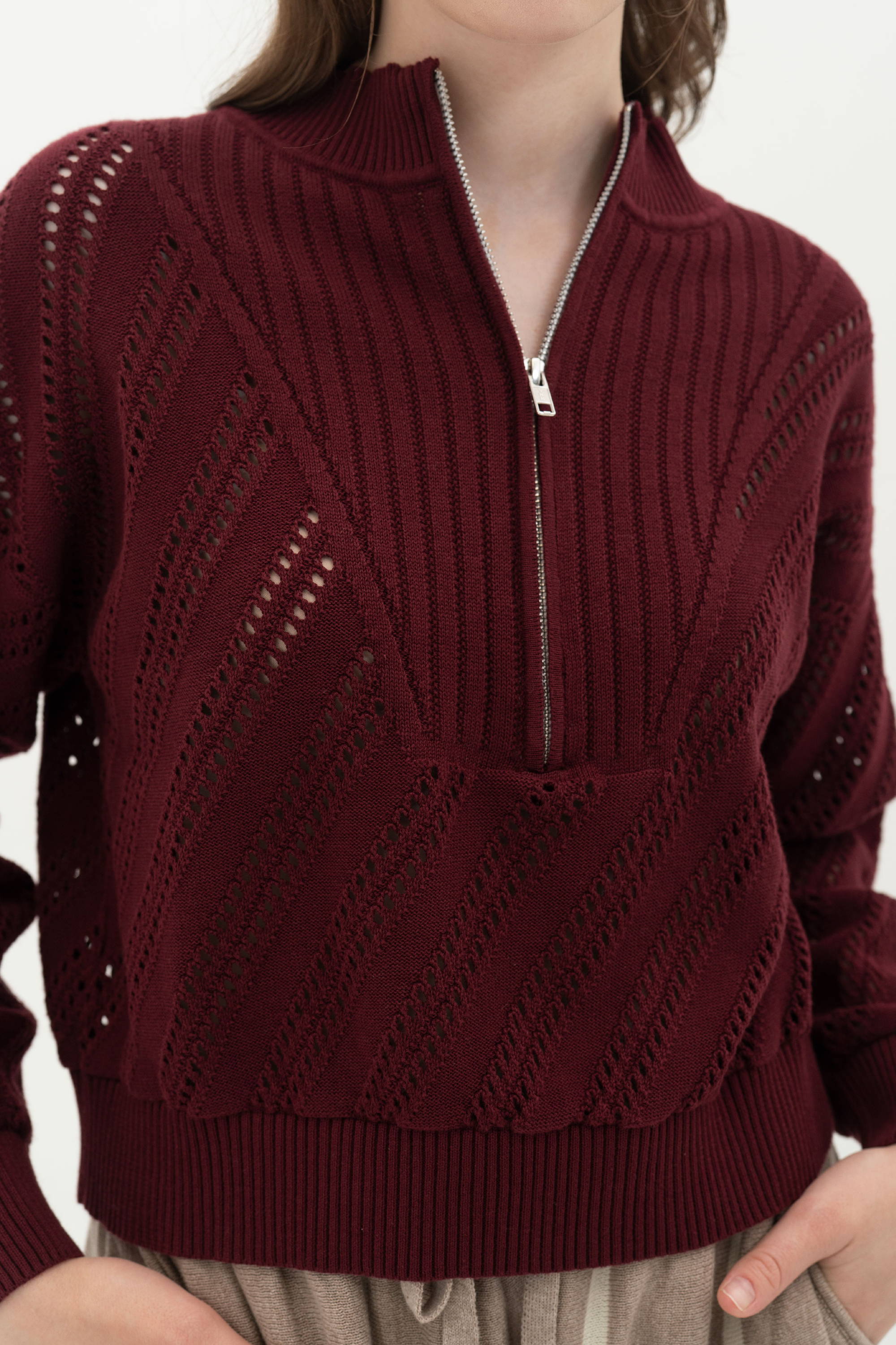 The Essential Perforated Zip Sweater arrives in maroon, a shade that enhances its relaxed and breathable open-knit texture. Designed for easy layering, it features a ribbed collar with a zip neckline that adjusts to your style. You can slip it on after a workout or wear it casually throughout the day.