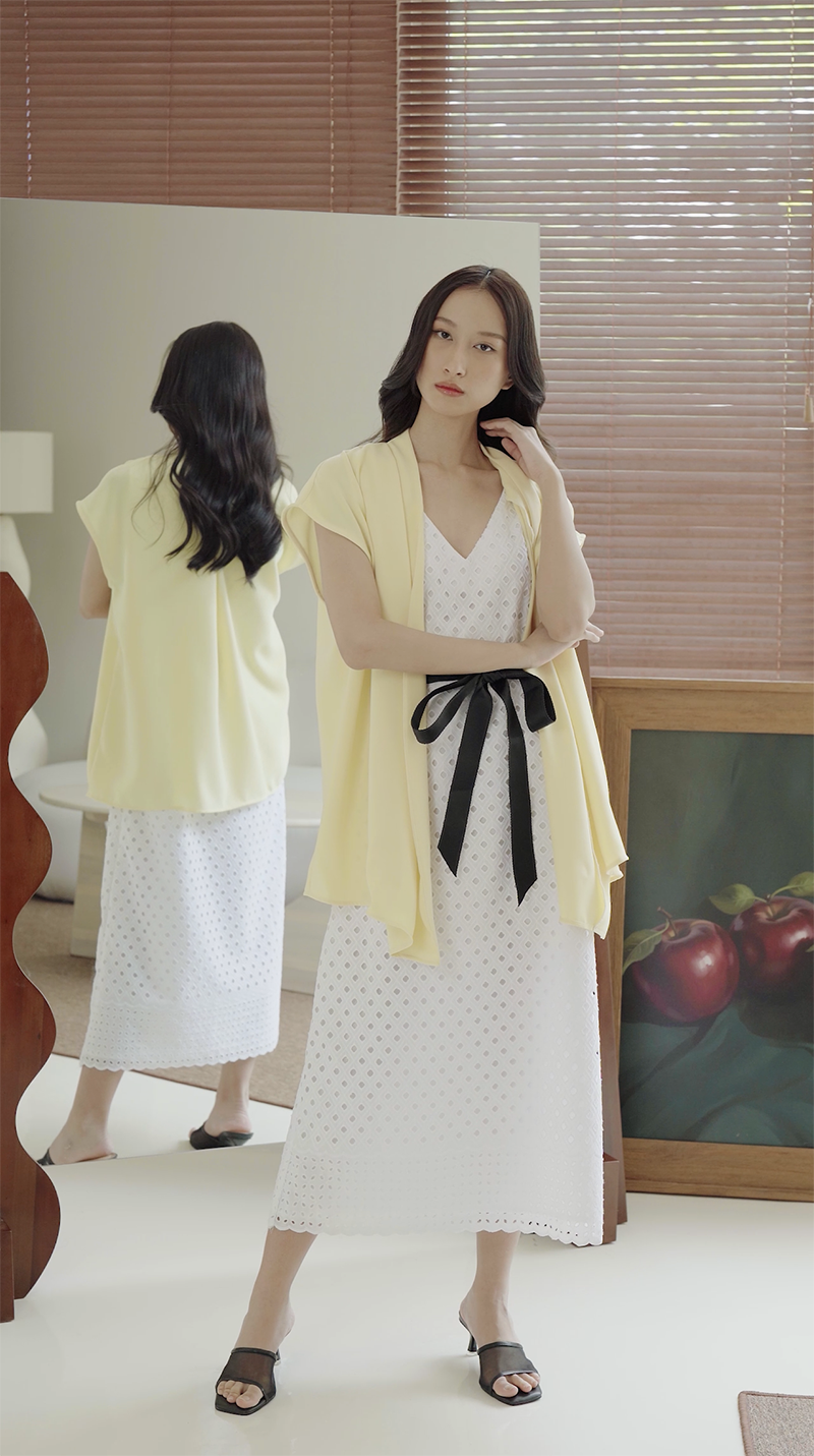 Pairing Butter Yellow with white creates a clean and fresh combination. The vest adds warmth and a gentle hint of color to the soft white dress, while the ribbon detail keeps it playful and sweet. It’s the kind of outfit that feels light, effortless, and perfect for sunny days or casual gatherings.
