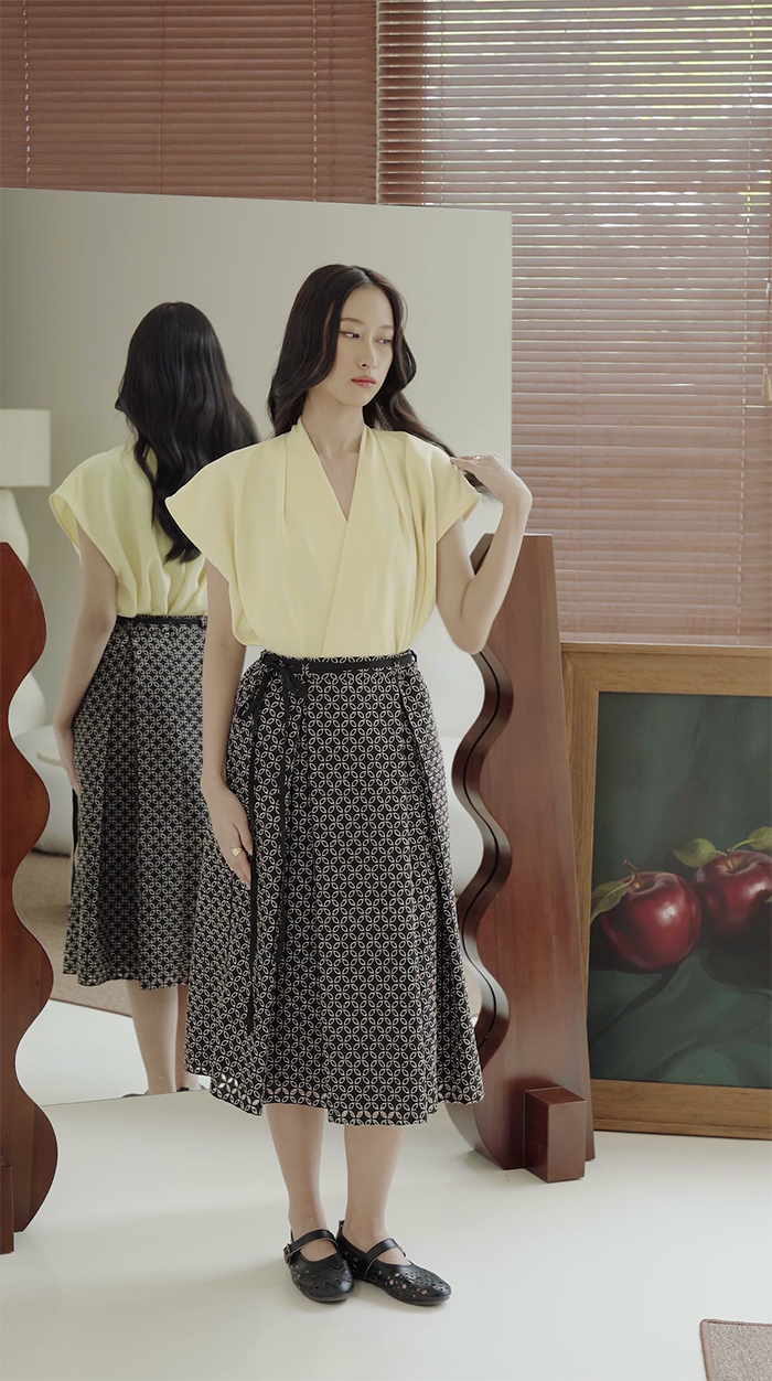 Butter Yellow and black create a balanced look that feels both elegant and eye-catching. The soft yellow vest brightens the outfit, while the black pleated skirt adds depth and sophistication. The embroidered details bring a feminine touch, making this look perfect for both work and dinner occasions.