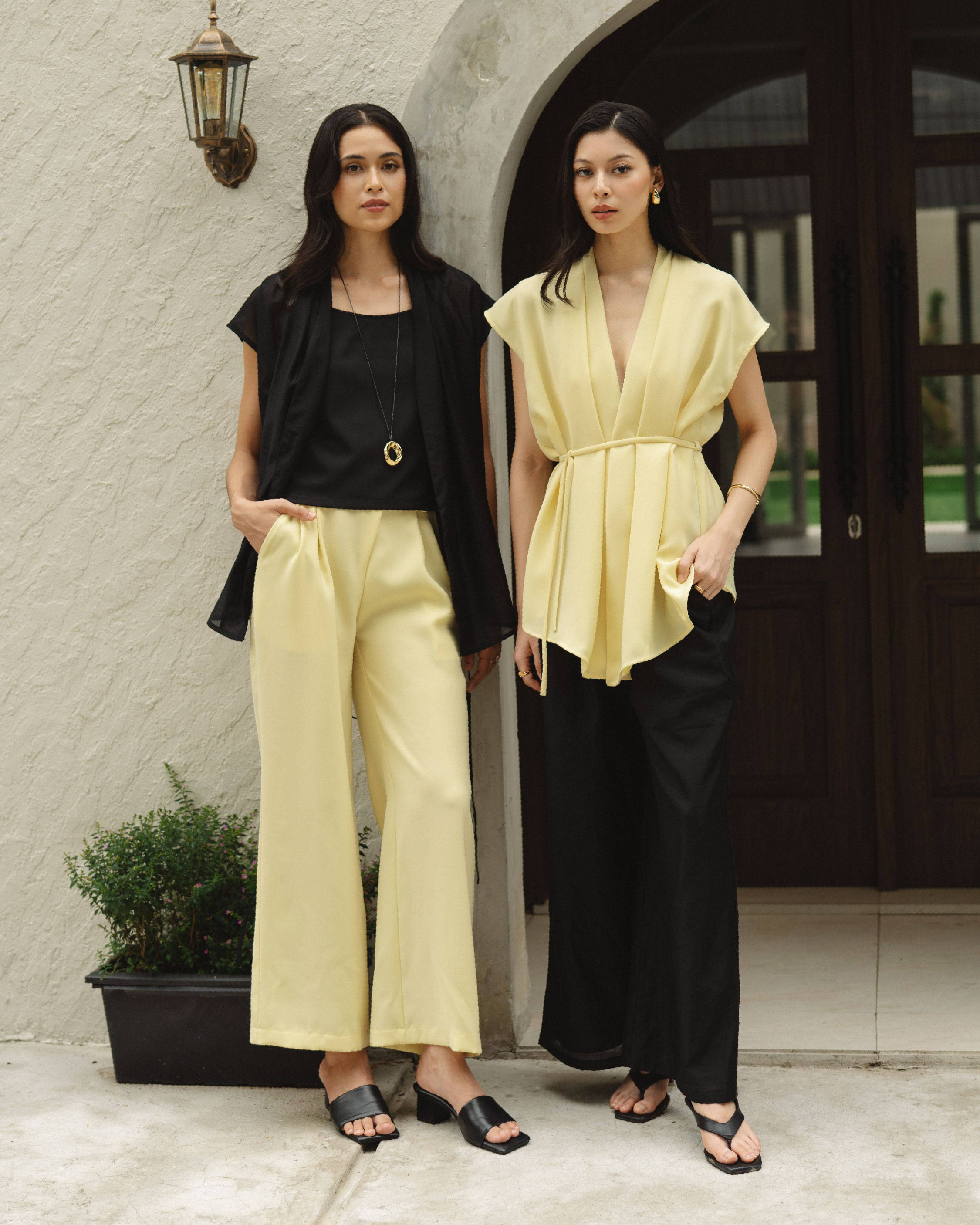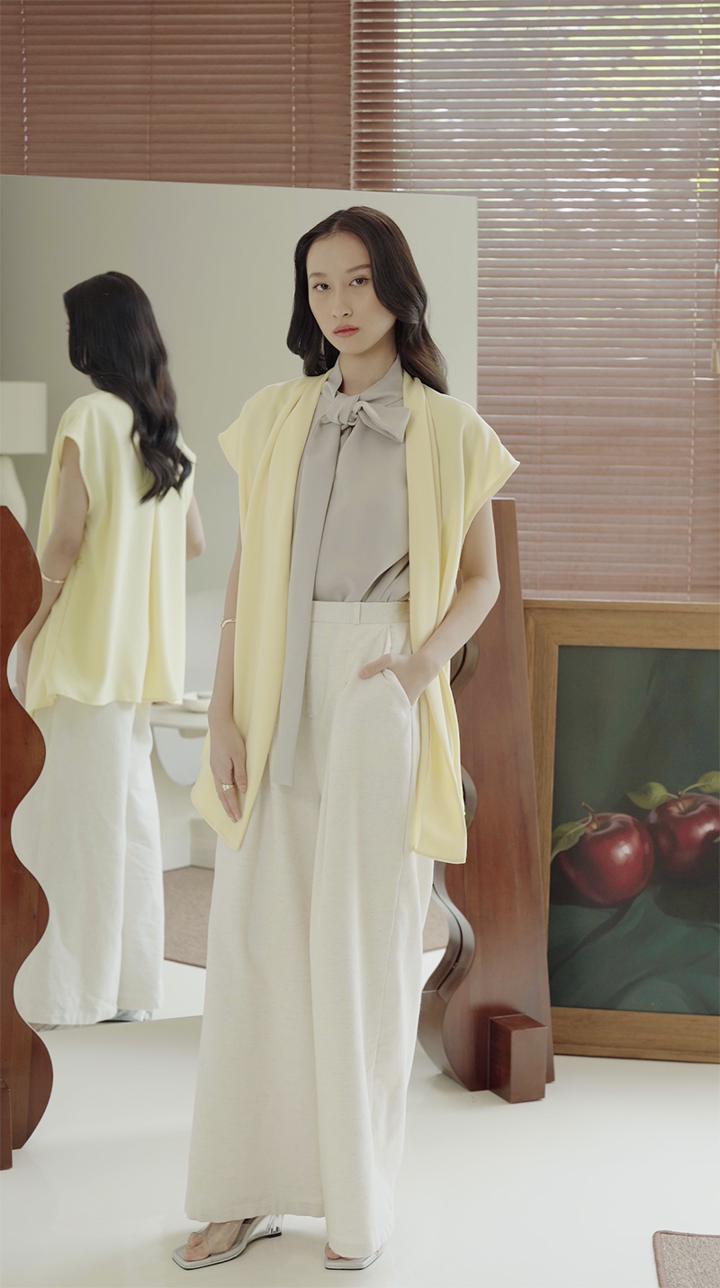 Cap-Sleeved Tie Waist Vest In Butter Yellow, Scarf-Neck Sleeveless Top In Taupe & Natural Pleated Wide Leg Pants In Broken White