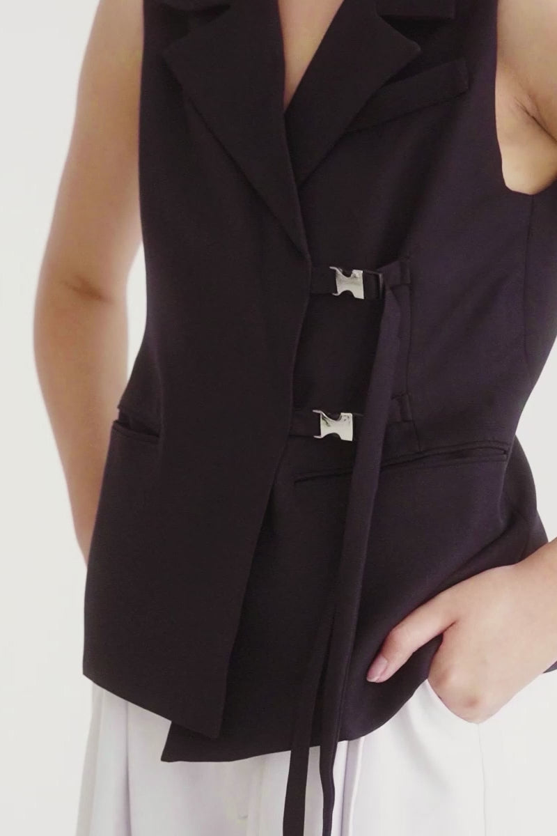 Hardworking wardrobe staples are Onycha’s specialty. Our Buckle 15 Collar Vest is precisely cut for a fitted silhouette from 100% polyester-stretch fabric. Classically tailored with smart notch lapels and front welt pockets, it features two tonal buckled belts to cinch the waist, lending a utilitarian appeal. Complement yours with a pair of relaxed, wide-leg pants.