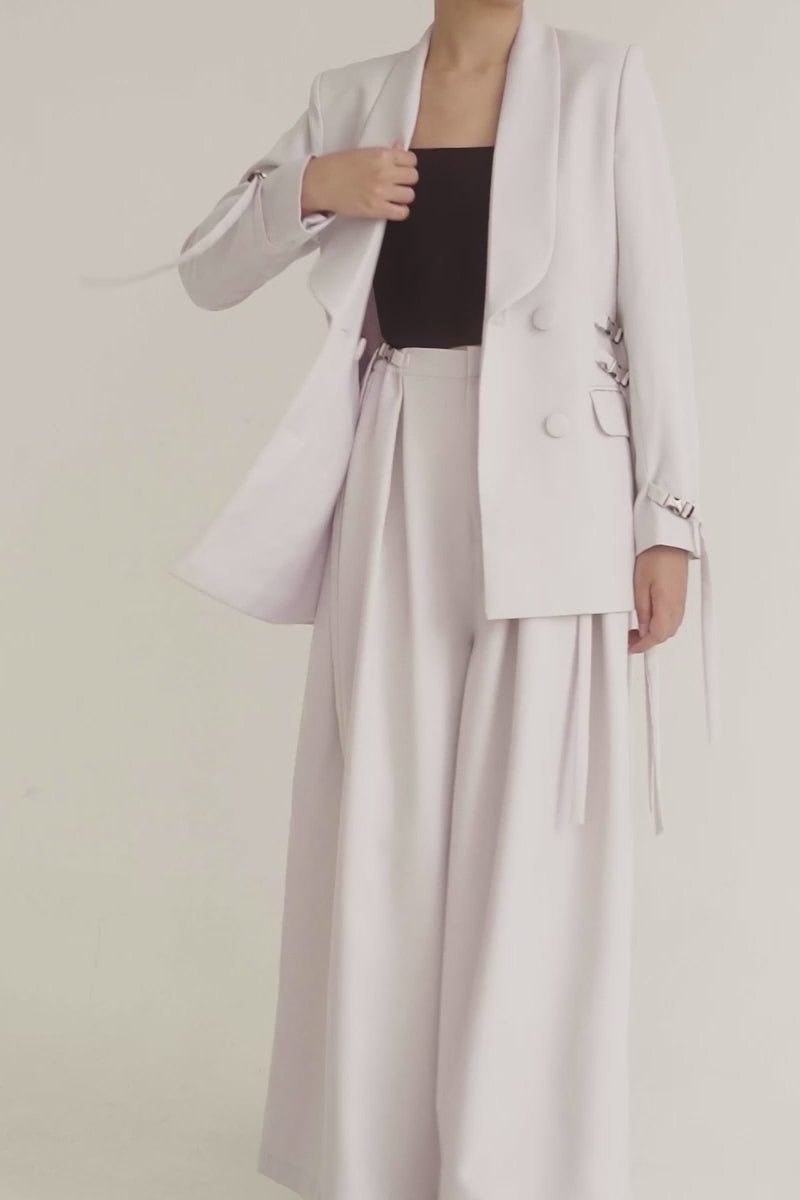 Tailored classic fitted blazer crafted with adjustable buckle accessories.