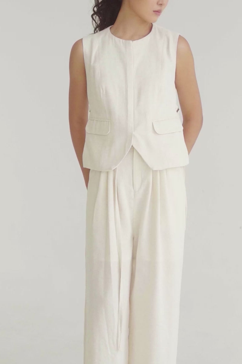 Characterized by elegance and modernity, our Buckle 15 Natural Vest is both minimal and refined, allowing you to dress it up with sharp tailoring or wear it casually with denim. Woven from cotton, recycled polyester, and linen, the full lining ensures it feels smooth against the skin. Tailored with flap pockets on the sides, it features a tonal buckled belt to cinch the waist. Wear yours with sharp pants and mules.