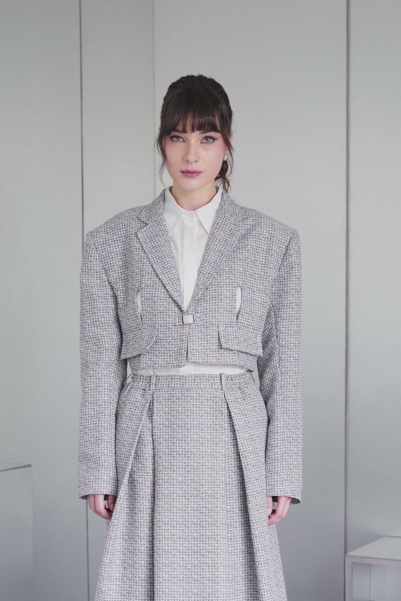 Made with the same eye-catching details that set Onycha apart, this exceptional piece is bound to become a favorite among the most fashionable women. Crafted from tweed, it is cropped and designed with classic notched lapels and equipped with shoulder pads. The slits on the front create a cheeky peek-a-boo effect, while the buckle fastening and leather strap details on the sleeves lend a utilitarian feel. Team yours with the coordinating pants for both work and play.