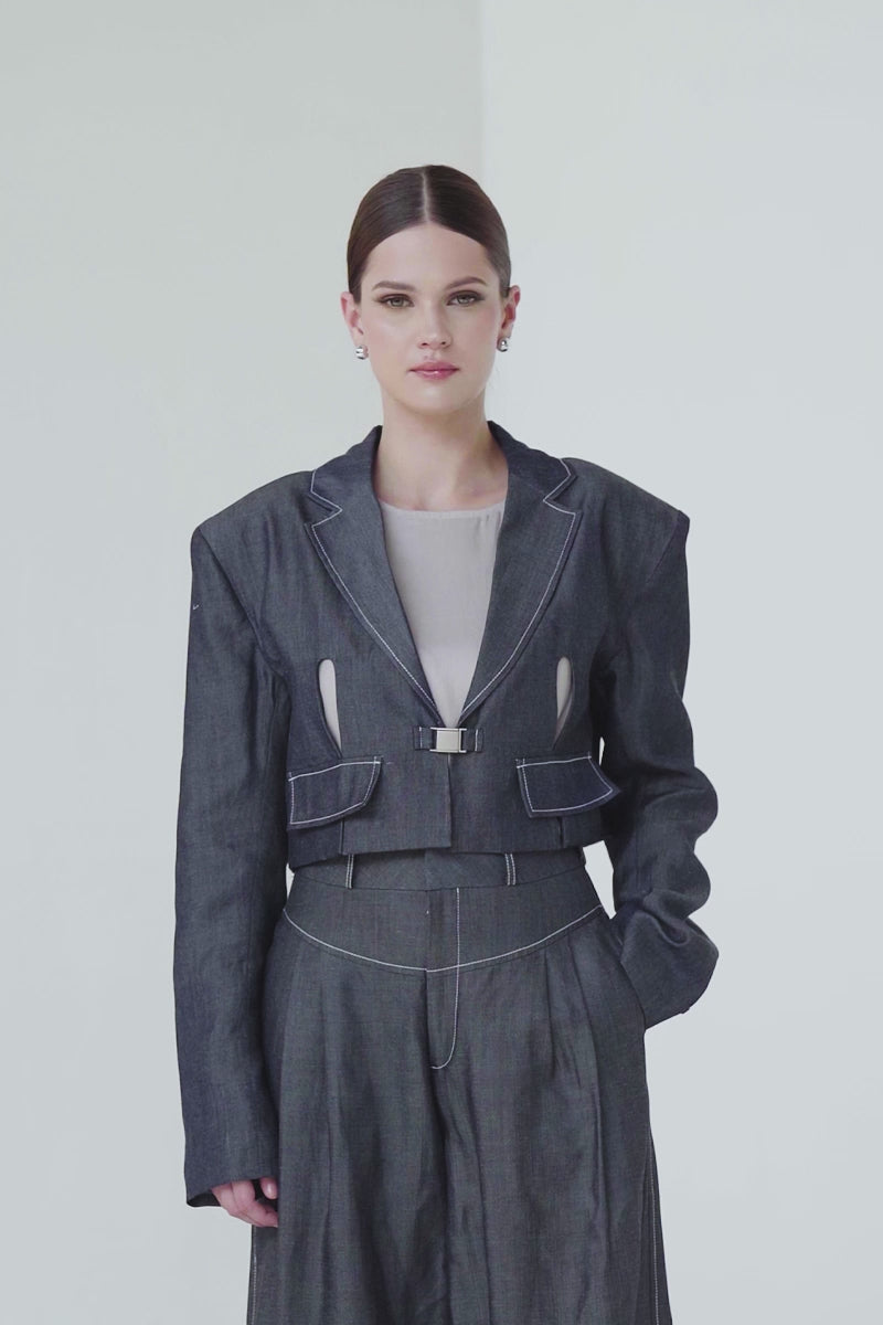 Made with the same eye-catching details that set Onycha apart, this exceptional piece is bound to become a favorite among the most fashionable women. Crafted from denim, it is cropped and designed with classic notched lapels and equipped with shoulder pads. The slits on the front create a cheeky peek-a-boo effect, while the buckle fastening and leather strap details on the sleeves lend a utilitarian feel. Team yours with the coordinating pants for both work and play.