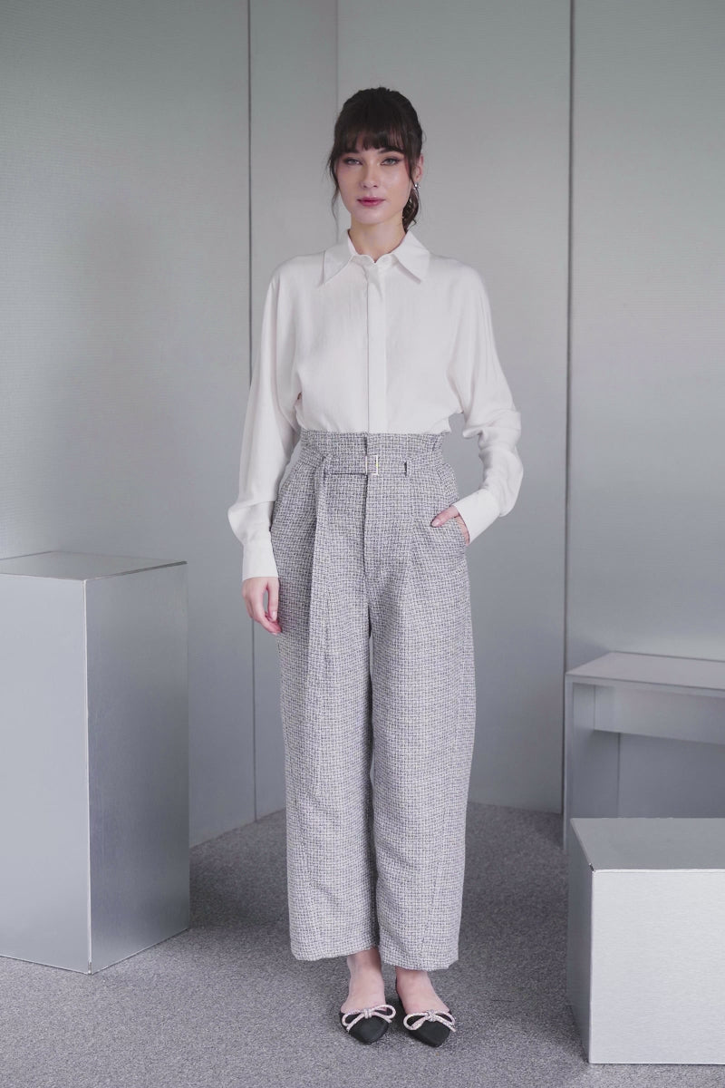 Buckle Straight Leg Tweed Pants In Stone Grey