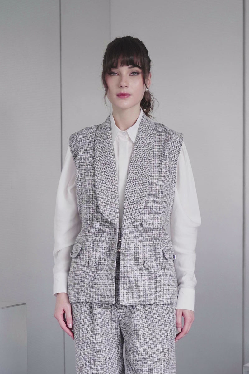 A chic, elevated take on corporate styles, Onycha’s Buckle Tweed Vest is designed with a shawl collar that instantly makes your outfit look super elegant. The flap pockets on both sides—beautifully adorned with a leather strap detail—as well as the adjustable back tab with a buckle to cinch the waist, add a utilitarian feel. Complete your look with the coordinating pants.