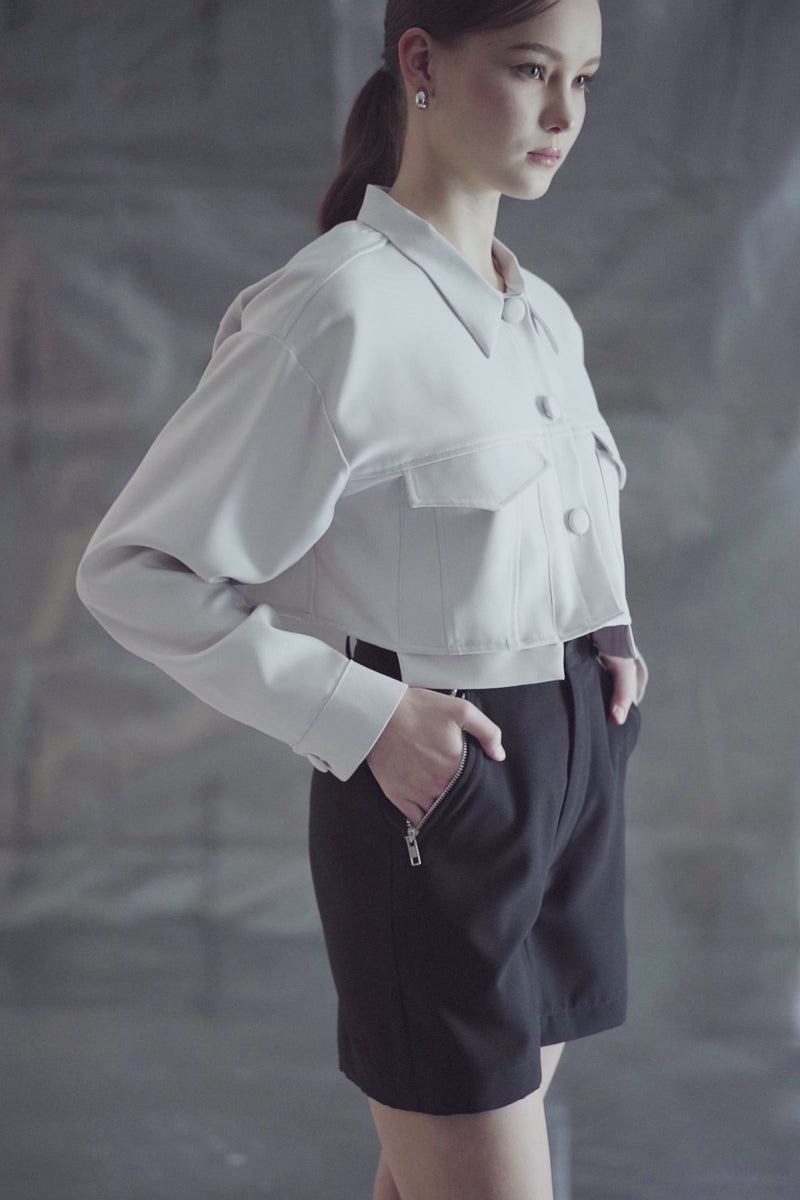 Thanks to its cropped hem, our Crop Pocket Shirt oozes a cool utilitarian feel. Made from polyester stretch fabric and classically tailored with a pointed collar, dropped shoulders, and utilitarian patch pockets, this shirt was designed to empower women to dress however they want. Style yours with everything from a pencil skirt to matching tailored pants.