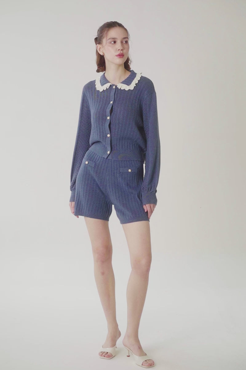 Lace-Knit Collared Rib-Knit Cardigan In Slate Blue