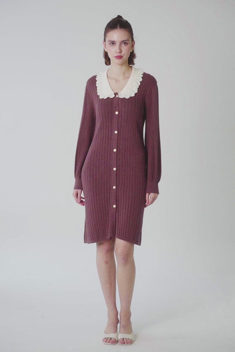 Lace-Knit Collared Rib-Knit Dress In Dark Mauve