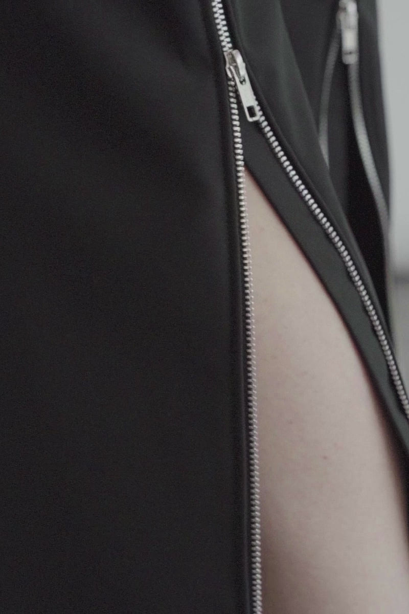 Our Zipper Back Pants have a streamlined design enhanced by the hidden fastening and elongating pressed creases. Made from stretchy polyester fabric, they sit high on the waist and fall to straight legs. The straight cuffs that zip open from the knee down allow more movement and are perfect to be worn over boots.