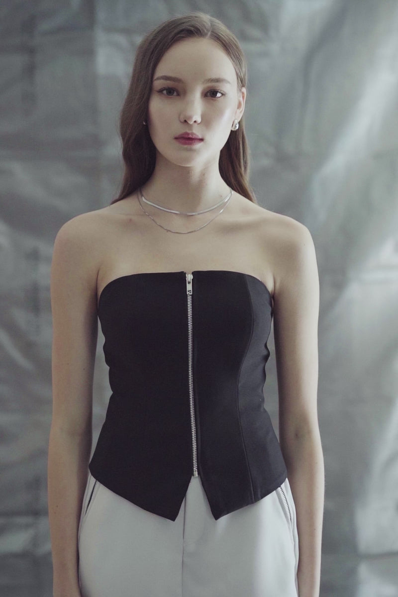 Sexy yet sophisticated, our Tube Top ensures you look undeniably chic for an evening out in the city. It's made from polyester stretch fabric that's accentuated with a silver zipper detail on the front. Designed with a strapless neckline, it’s equipped with internal boning and cups that offer support and structure, as well as an elasticated back for more comfort. We love styling it with statement earrings and relaxed pants.